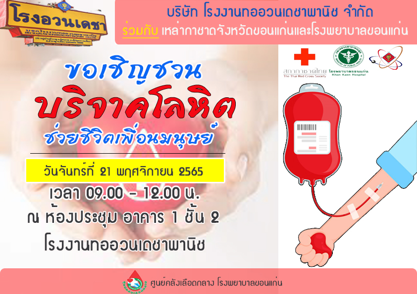 ร่วมกันบริจาคโลหิตในวันจันทร์ ที่ 21 พฤศจิกายน 2565 เวลา 09.00น. - 12.00น. ณ.อาคาร1ชั้น2